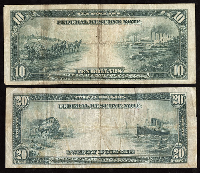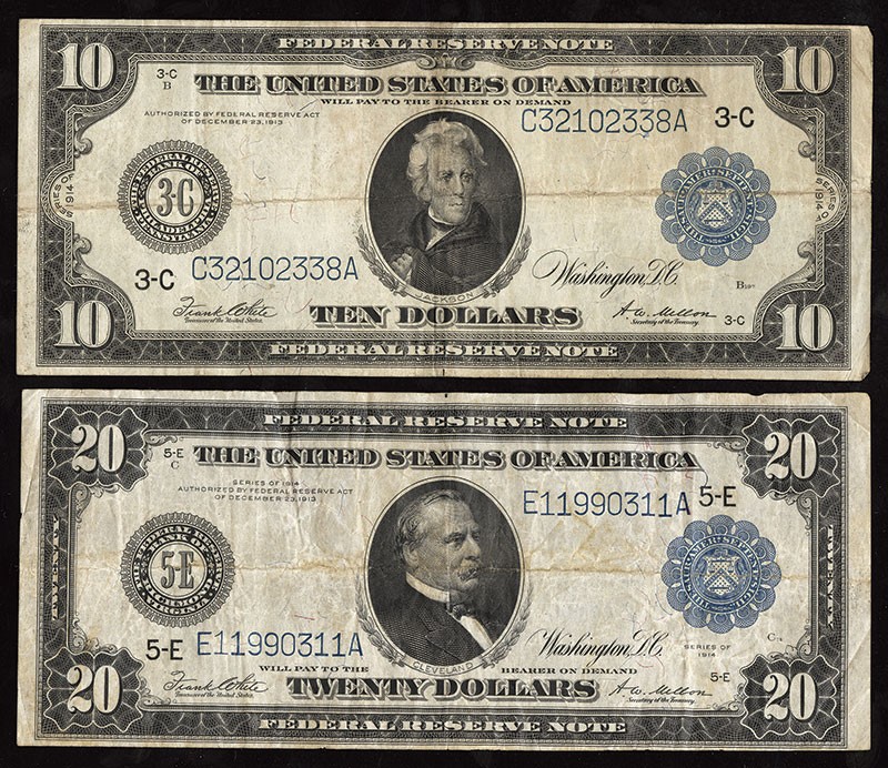 Federal Reserve Note Duo. 1) Fr.915A. $10. 1914. Philadelphia. F-VF, soiled on the back. 2) Fr.983A. $20. 1914. Richmond. F-VF. [2]