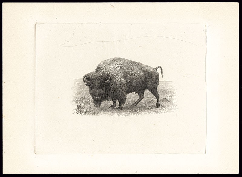 Bison Proof Vignette. India paper on card.15.5mm x 11.5mm. The bison from the $10 1901 Legal Tender. Excellent condition. Light pencil notations on the back.