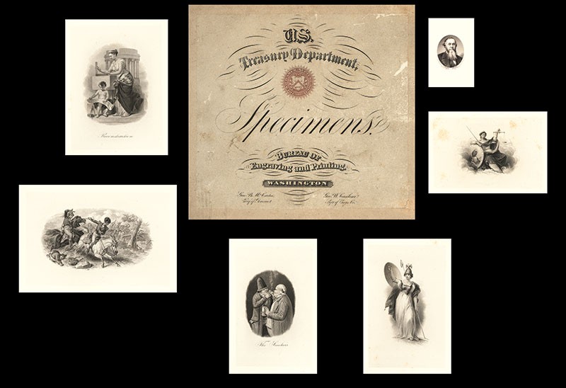 U.S. Treasury Specimen Vignette Book. Large oblong octavo, near quarto, 25cm by 18cm by 5cm. Rebound in red cloth with brown leather spine. The title page states "U.S. Treasury Department, Specimens. Bureau of Engraving and Printing. Washington. Geo. B. McCaree, Chief of Bureau - Geo. W. Casilear Supt of Eng'sVc."