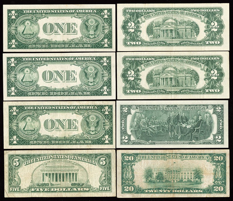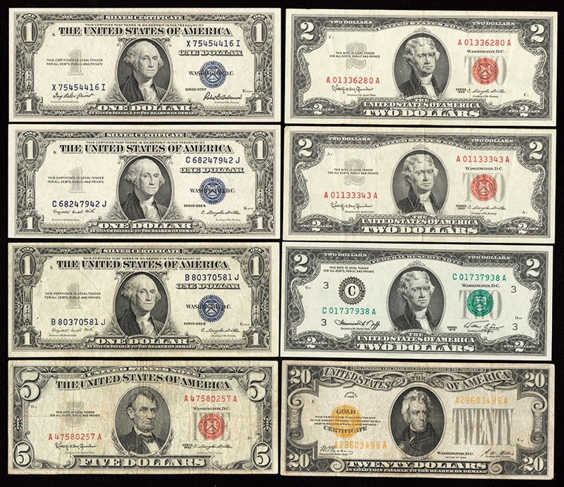 Assorted Small Sized Notes. 1) $20 Gold Note. 1928. Fine. 2-3) $2 LT.1963. Both AU. 4) $5 LT. 1963. VF. 5) $1 SC. 1935F AU. 6-7) $1 SC. 1935G. AU, VF. 8) $2 FRN. 1976. AU. [8]