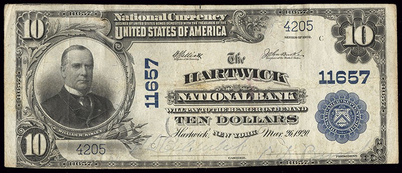 NY. Hartwick. Ch. 11657. Hartwick National Bank. $10 1902 PB. Fr.633. No. 4205. Plate C. VF, with a small trace of a teller stamp above the left signature. This is only the third $10 PB reported on this bank. A similar example, without the teller's stamp, brought over $4,000 in the October 2012 Heritage sale.