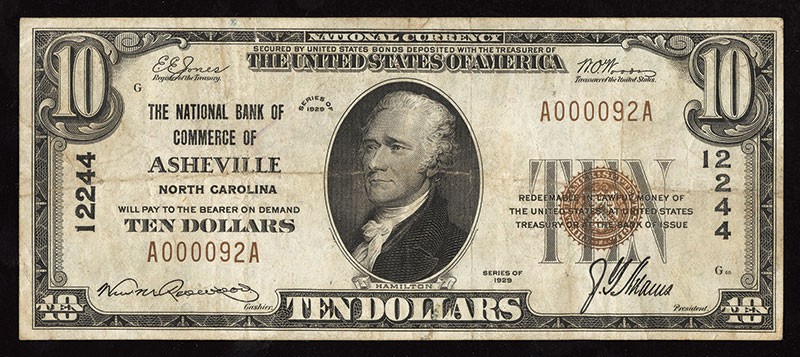 NC. Ashville. Ch.12244. National Bank of Commerce of Ashville. $10. 1929.Fr.1801-1. No.A000092A. G. Fine. Some light fold stains visible.