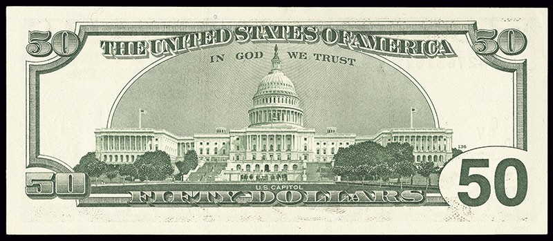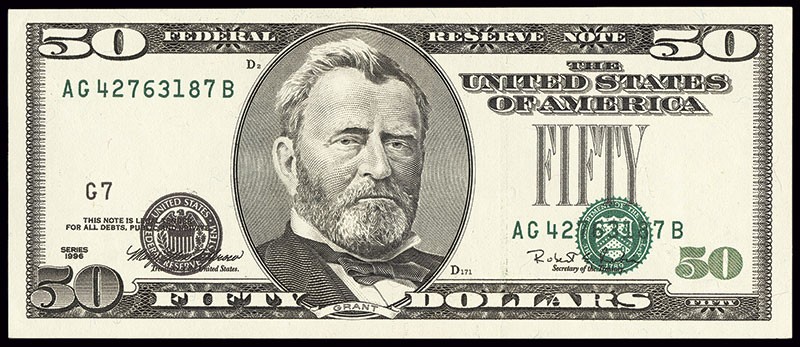 $50. FRN. 1996. Seals shifted down into the signature blocks. Choice CU.