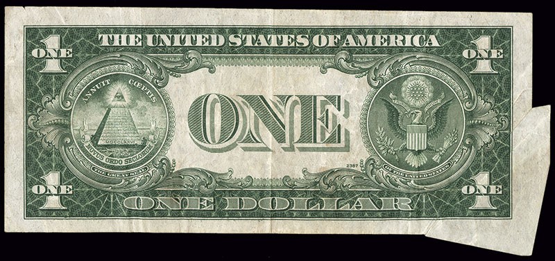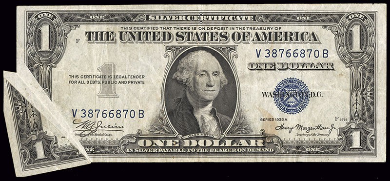 $1. Silver Certificate. 1935A. No.V38766870B. Gutter fold. Butterfly wing. The first printing (back) was fine. During the second printing the sheet was crumpled and remained that way as the cutting process occured. VF, with a light stain.