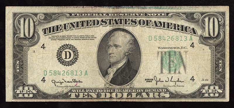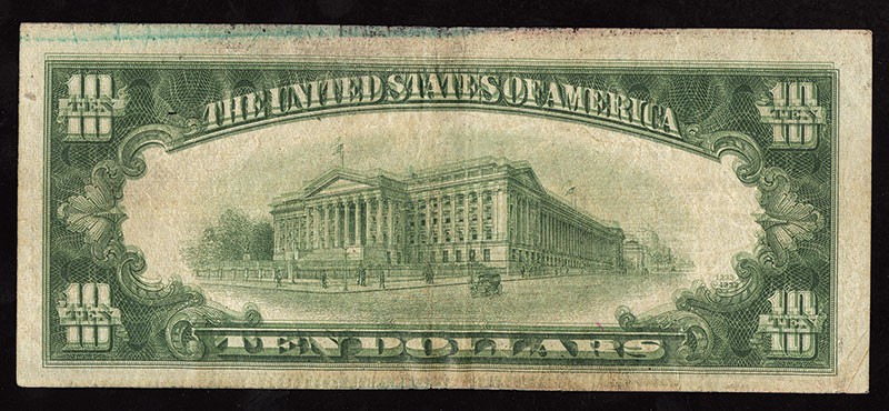 $10. FRN. 1950. No.D58426813A. Double printed back. The first printing, the green back, received two separate impressions, 2mm apart, resulting in a very clear doubling of the back image. Fine, with a light blue green stain along the top margin on both sides.