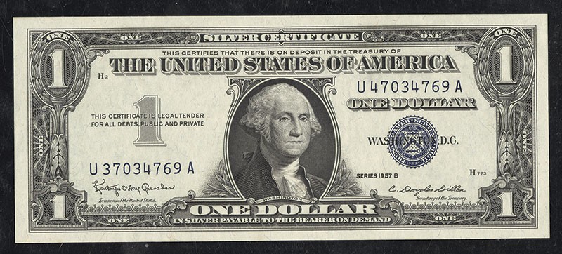 $1. Silver Certificate. 1957B. No.U37034769A, left. No.U47034769, right. Mismatched serial numbers. PCGS Superb Gem New 68 PPQ.