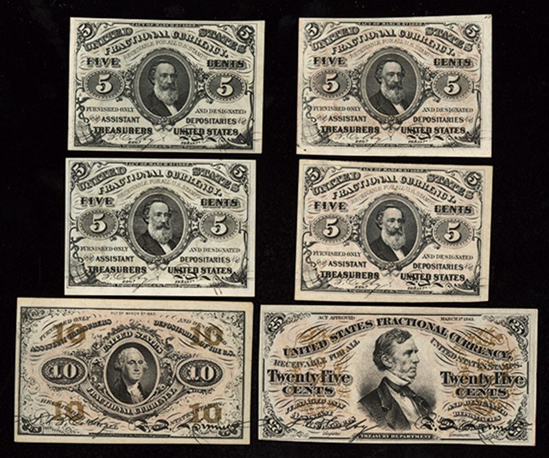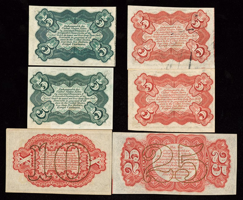 High Grade Third Issue Fractional Assortment. 1) Fr.1236. 5 Cents. Red. Unc. 2) Fr.1237. 5 Cents. Red. a. AU, stain. 3) Fr.1238. 5 Cents. Green. Unc. 4) Fr.1239. 5 Cents. Green. a. AU. 5) Fr.1251. 10 Cents. Red. Unc. 6) Fr.1291. 25 Cents. Unc. [6]