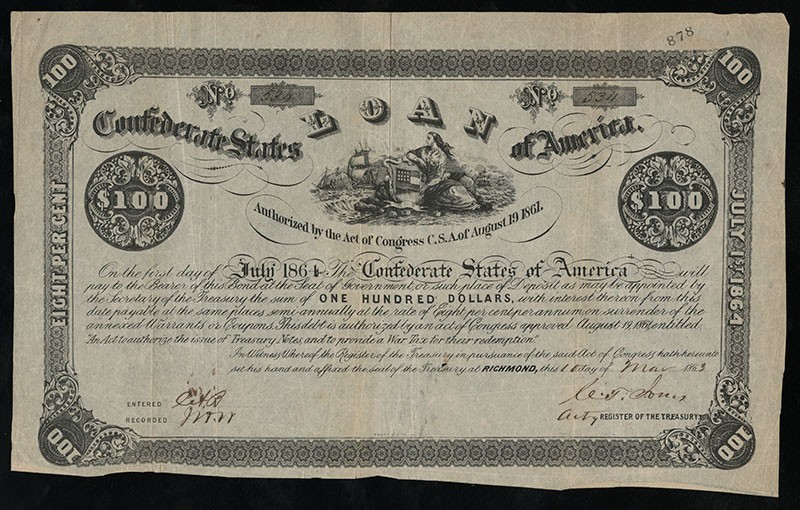 CSA. $100. Ball-30. Cr.22. Due date July. 1, 1864. No.534. Liberty, Flag & Shield. Signed by Jones. VF, "878" stamped in the upper right margin. A nice example of the first issue with this design.