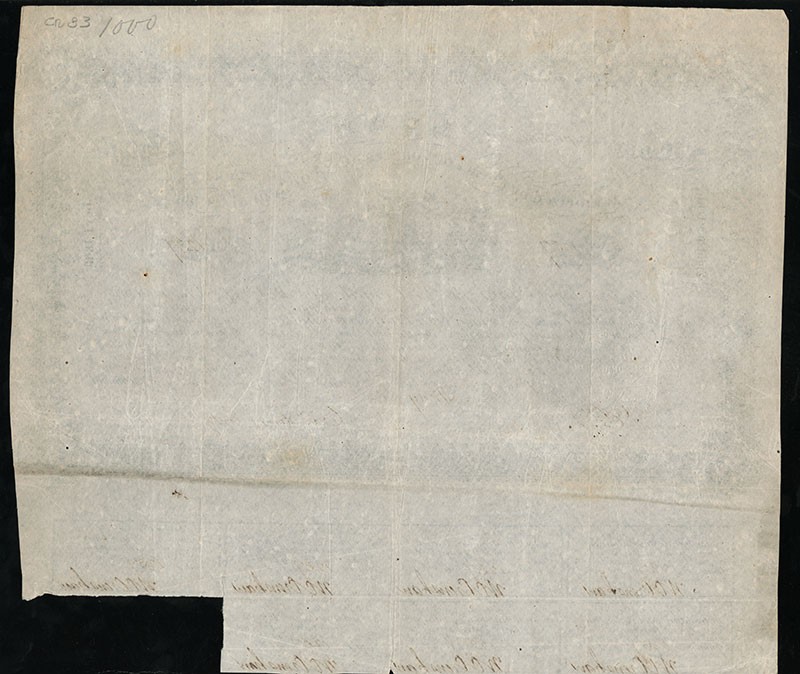 CSA. $1000. Ball-53. Cr.83. No.1237. Train and telegraph poles. Signed by Jones. 7 coupons. VF+.
