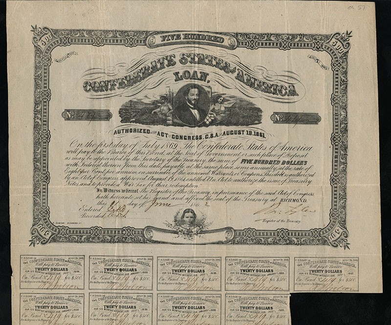 CSA. Trio of Act of August 19, 1861 Bonds. 1) $100. Ball-54. Cr.29. VF+, but with a repaired split in the top margin. 2) $500. Ball-120. Cr. 57. VF+. 3) $1000. Ball-56. Cr.84. VF+, some soiling near the lower right border. All with 2 or 3 rows of coupons. [3]