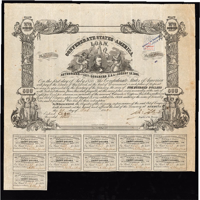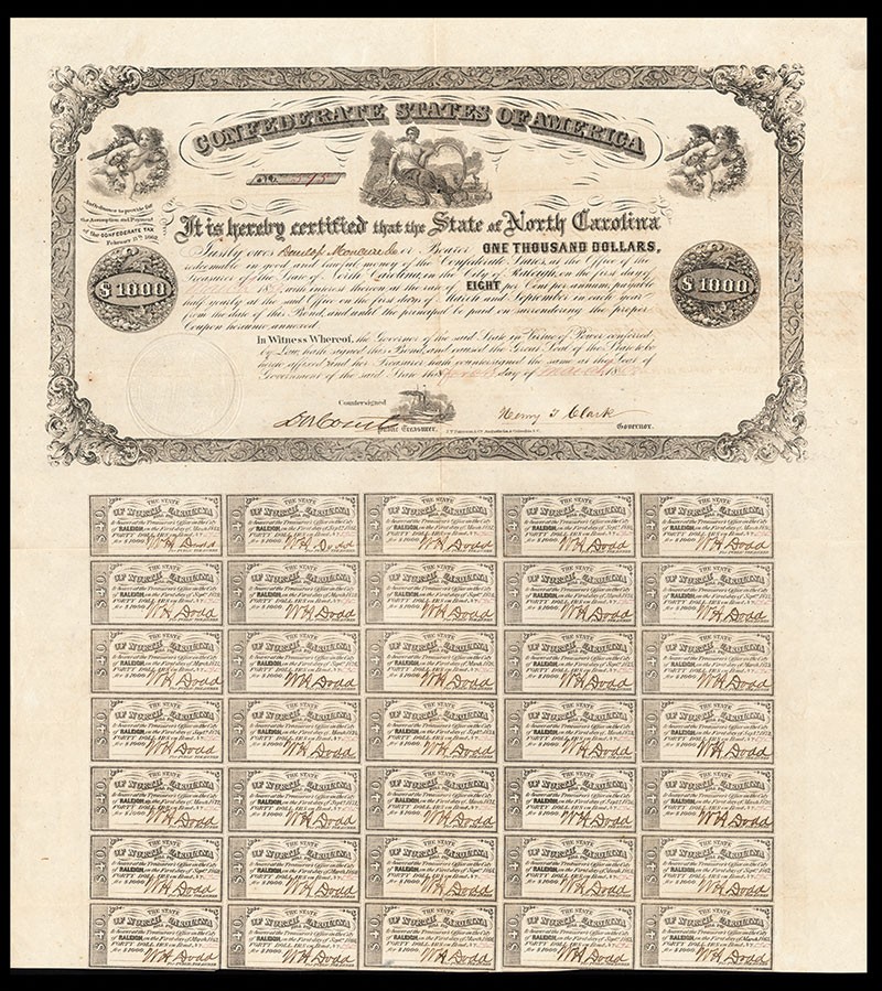 CSA and North Carolina Bond Duo. 1) $500. B-58. VF+. 2) $1000. North Carolina. 1862. Cr.621. Cupids in the upper corners. VF+. [2]