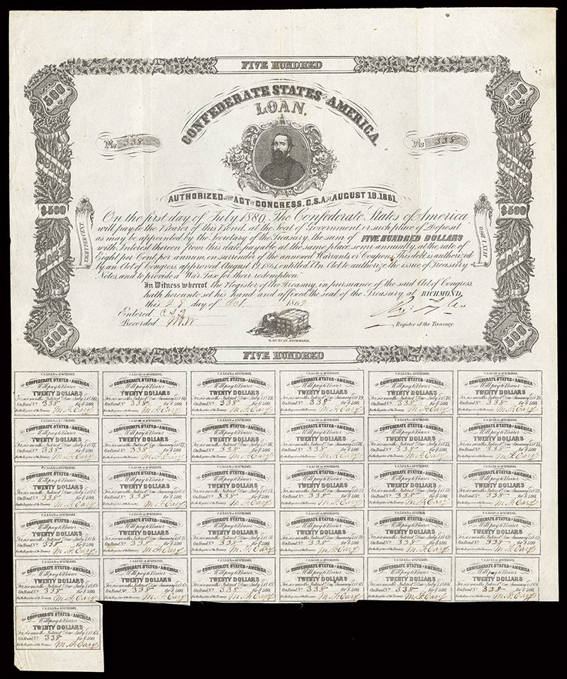 CSA. $500. Like Ball-127. Cr.74. Due date July 1, 1880. No.338. Trans-Mississippi. Issued by James Sorley. Signed by Tyler. 26 Coupons. VF+. Bright. Narrow but complete margin on the left side. The other margins are quite adequate. Nice paper quality for this rarity.