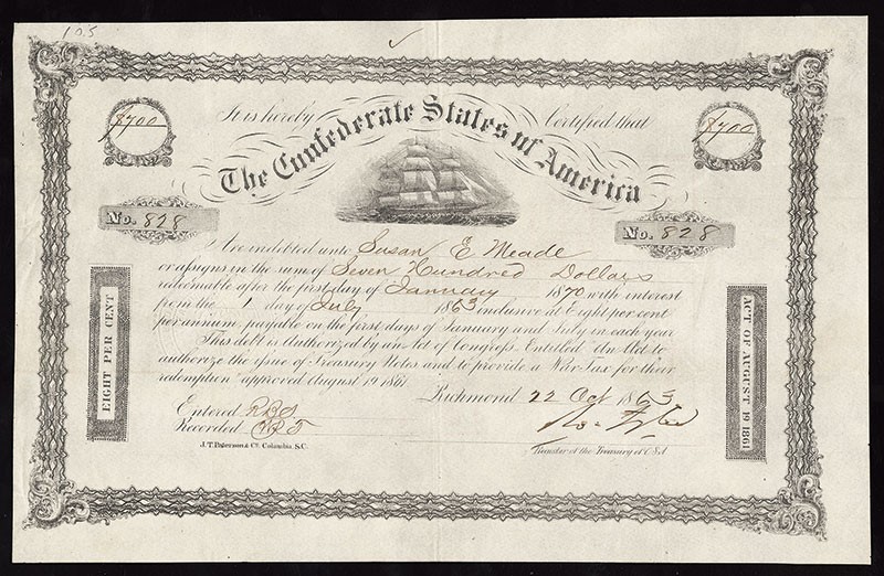 CSA. $700. Ball-140. Cr.105. 1863. No.828. Registered bond. Issued to Susan Meade. Signed by Tyler. VF+, Fresh, bright and attractive. Rarity 8 per Fricke.