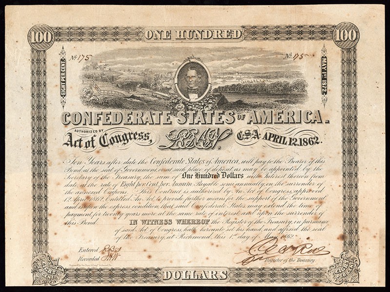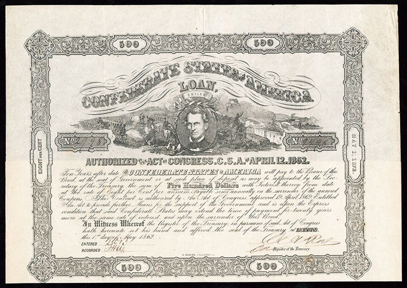 CSA Memminger Bond Duo. 1) $500. Ball-147. VF+. 2) $100. Ball-148. No.175 of only 350 issued. VF. Age toning spots present throughout.