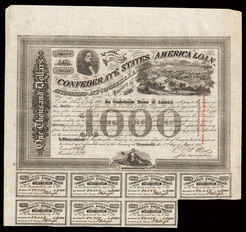CSA. $1,000. Ball-203. Cr.125. Due date July 1, 1868. No.42050. Trans-Mississippi. Shreveport, Louisiana. Signed by Rose. Issued by Battle. "This Bond NOT TO BE VALID until Endorsed by the Depositary who issues it" in two red lines near the right end. VF+. 7 Coupons. A really nice example of this popular issue.