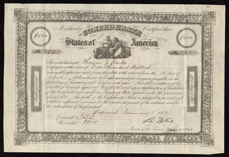 CSA. $500. Ball-27. Cr.14. 1863. No.1521. Registered bond. Issued to Thomas J. Starke. Signed by Tyler. VF+, very clean and appealing.