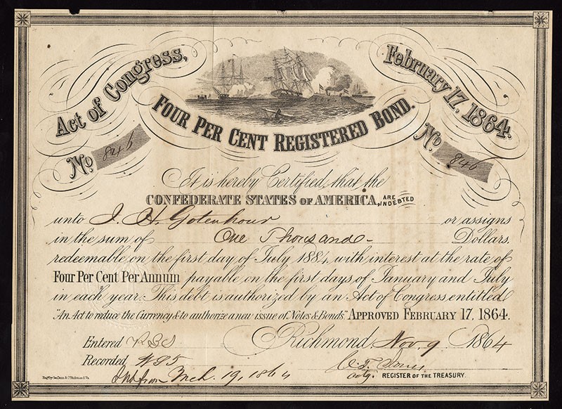 CSA. $1000. 4% Registered Bond. Ball-290. Cr.141B. 1864. No.846. CSS Virginia sinks USS Cumberland. Signed by Jones (Ball reports only Tyler). VF+ with a small chip out of the top margin, and a tiny ink erosion split.