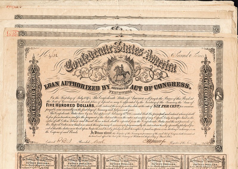 1) $100. B-299. 1st Series. Complete with all coupons. 2) $100. B-303. 2nd Series. 3) $500. B-304. 1st Series. 4) $500. B-309. 2rd Series. 5) $500. B-312. 3rd Series. Sign by Apperson. 6) $500. Ball-313. 4th Series. Complete with all coupons. 7) $1,000. Ball-317. 1st Series. No.3716. 8) $1,000. Ball-322. 2nd Series. 9) $1,000. Ball-327. 4th Series. 10) $1,000. Ball-330. 6th Series. Most are VF+ or better, A few with minor splits. [10]