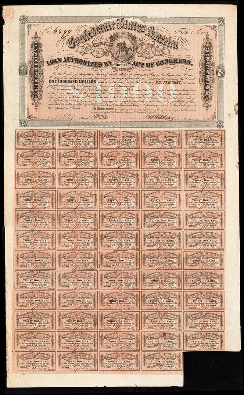 CSA. $1000. 6% Bond. Ball-329. Cr.144D. Fifth Series. 1864. No.6899. Orange-red & Black. Washington. Confederate flag. All but one coupon present. VF+.
