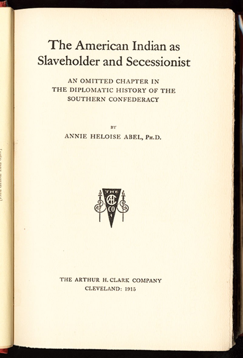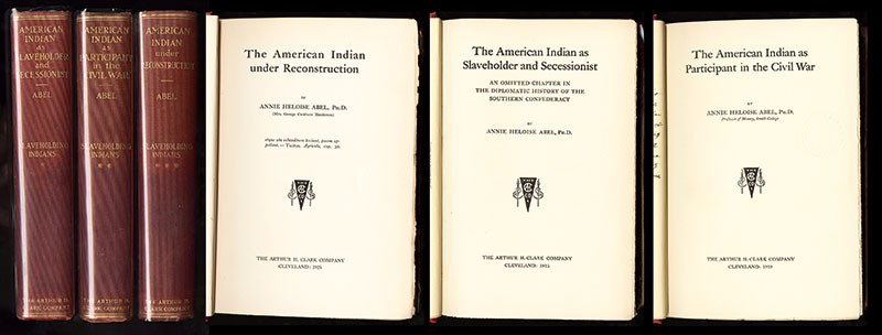 Civil War. Abel, Annie Heloise: The Slaveholding Indians. Cleveland, Arthur H. Clark Co., 1915-1925. 3 Volumes. 8vo, red cloth covers. First Edition. Vol. I: American Indian as Slaveholder and Secessionist; Vol. II: American Indian as Participant in the Civil War; Vol. III: American Indian under Reconstruction. Important work on Native Americans in the south and their involvement in the Civil War. Ex Libris: Dyer Library, Saco Maine. Library marks on back endpapers, and pencil notation on front, otherwise pleasing Very Good [3]