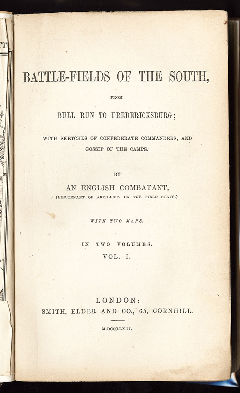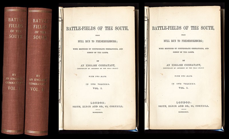 Civil War. Caffey, Thomas E.: Battlefields of the South from Bull Run to Fredericksburg; with Sketches of Confederate Commanders, and Gossip of the Camps by an English Combatant. London, Smith , Elder & Co., 1863. 2 Volumes. 12mo, red cloth board covers, new spines professionally applied, folding maps, reinforced original advertisement endsheets, 339 and 399pp. An Englishman, Caffey, who dedicates his work to Jefferson Davis, served briefly in the Confederate army as lieutenant of artillery on the field staff. His book has become one of the most consulted of Southern sources for information on military operations. A Very scarce and collectable first edition, About Fine.