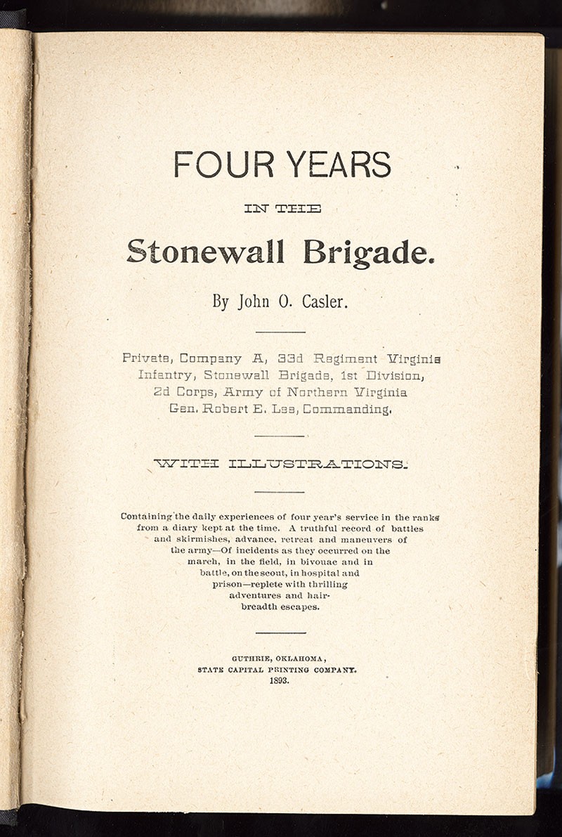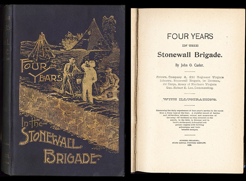 Civil War. Casler, John Overton: Four Years in the Stonewall Brigade. Guthrie, OK, State Capital Printing Company, 1893. Small octavo, illustrated blue cloth cover, floral endpapers, 495pp. First Edition. As much a rogue as a rebel, and far from a model soldier, Private Casler pens the verité of camp life and combat and the harsh existence in Stonewall's ranks. His frank confessions of his service in the Army of Northern Virginia and his unapologetic recollections are among the most sought after and cited accounts of a Confederate soldier. Rare first edition in excellent shape, Fine.