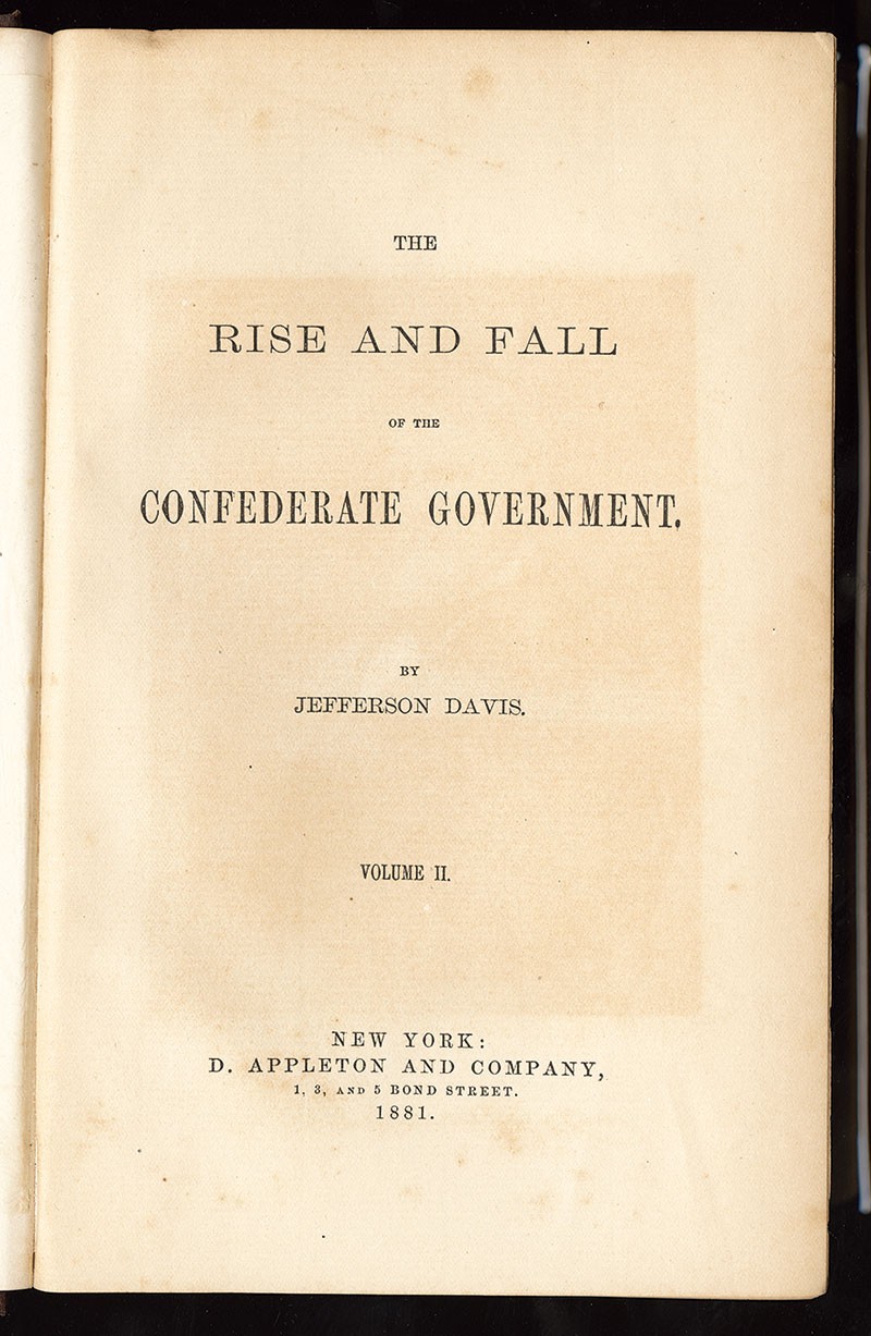 Civil War. Davis, Jefferson: The Rise and Fall of the Confederate Government. New York; D. Appleton and Company, 1881. 2 Volumes. 8vo, gilt-illustrated, pebbled red cloth covers with gilt-lettered spine, illustrated with 19 full-page steel plate engravings and 18 maps (many folding), 707pp + 4 adv, and 808pp with 4 adv. Jeff Davis' argumentative dissertation on secession and states' rights, which is not too revealing of the inner workings and history of the CSA, but nonetheless an important history of the Confederacy penned by its president. Light pencil marks front endpapers, very minor foxing and cover scuff, small dirt spot back inside cover; a clean and sound first edition set, Very Good.