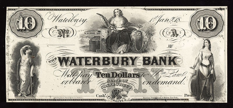 CT. Waterbury. Waterbury Bank. $10. 1850s-60s. (G10a) Proof on card. Commerce seated, flanked by 1 and 0. Justice. Woman standing. Uncirculated. Light ink stains. Possibly a later printing from the original plate.
