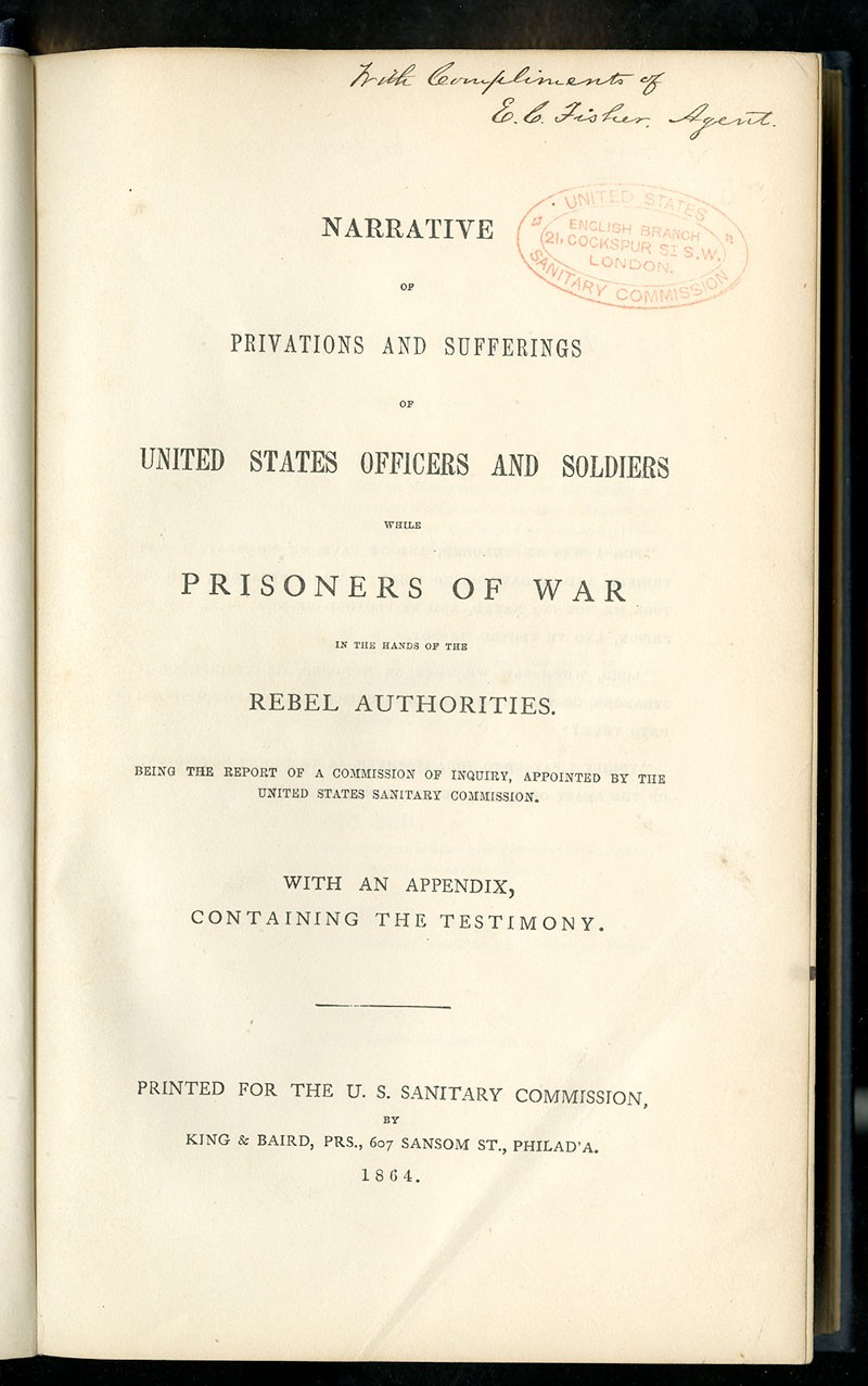 Prisons and Civil WarU.S. Sanitary Commission: Narrative of the Privations and Sufferings of United States Officers and Soldiers While Prisoners of War in the Hands of the Rebel Authorities. Philadelphia; King & Baird, 1864. 8vo, gilt title on blue cloth covers and later marbled endpapers, "Copies of Photographs of Union Soldiers after Their Return from Imprisonment At Belle Isle," with supplement, 283pp. An extensive report by the Commission which includes "Evidence Relating to United States Stations for Rebel Prisoners." Contemporary signature on title page "With Compliments of E.C. Fisher. Agent" and red stamp seal of the United States Sanitary Commission, London. "Ex Libris Raymond L. J. Riling" inside cover. Some foxing on blank adjacent pages to photo copies, otherwise Near Fine