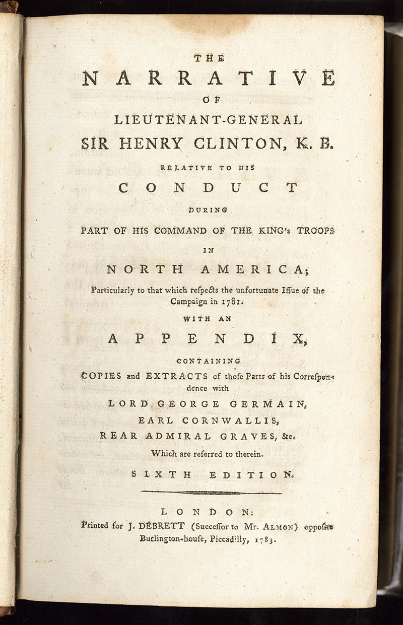 [American Revolution]. Clinton, Sir Henry: The Narrative of Lieutenant-General Sir Henry Clinton, K.B., Relative to His Conduct During Part of His Command of the King's Troops in North America; Particularly to that which respects the unfortunate Issue of the Campaign in 1781. With: Cornwallis, Earl: An Answer to that Part of the Narrative of …Clinton; With: Clinton, Sir Henry: Observations on Some Parts of the Answer. London, printed for J. Debrett, 1783. Octavo, contemporary full tan calf, red morocco spine. Sixth edition, published in the same year as the first edition, of Sir Henry Clinton's justification of his actions in the American campaign, bound together with a first edition of Cornwallis' response, and a first edition of Clinton's rejoinder, with folding chart illustrating the respective strengths of the military forces deployed in North America. Clear guard over covers bound down on inside board. Rear joint starting, trivial pencil notations endpapers, otherwise the contemporary binding is in excellent condition, and the contents clean and bright. Very Good. Sir Henry Clinton arrived in Boston in 1775 along with Major Generals William Howe and John Burgoyne to strengthen General Gage's position. In 1778, Clinton succeeded to the supreme command of British forces in North America after General Howe's resignation. After the fall of Charleston, which Clinton had under siege, he returned to New York leaving his second-in-command Lord Cornwallis in charge of the subsequent operations that led to the capitulation in Yorktown and the peace treaty which recognized American independence. Clinton returned to England in 1782 to find himself blamed for the defeat at Yorktown and Cornwallis conversely viewed with sympathy. With this "Narrative," Clinton defends his actions in the war and lays the blame at Cornwallis' feet. An indignant Cornwallis, in turn, defends himself with an Answer to the Narrative, which is then rebutted and replied to by Clinton in Observations on Some Parts of the Answer - both included here.