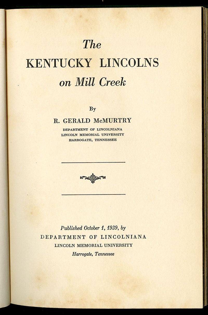 [Lincolniana]. McMurtry, Robert Gerald: The Kentucky Lincolns of Mill Creek. Harrogate, TN; Lincoln Memorial University, 1939. Small octavo, green cloth covers, plates, map, viii, 78pp. First Edition. No. 96 of a limited printing of 250 numbered copies signed by the author. Important resource by a noted Lincoln scholar. No dust jacket, Fine.