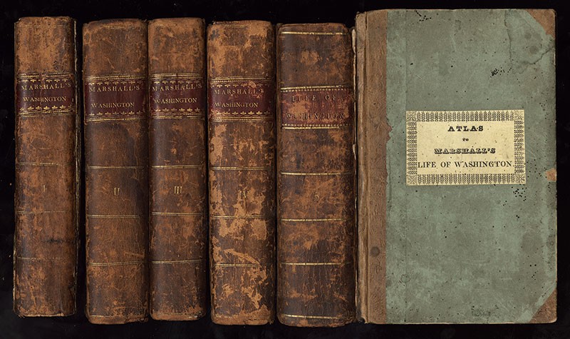 [Washington, George]. Marshal, John: The Life of George Washington Commander in Chief of the American Forces. Philadelphia, C.P. Wayne, 1804-1807. 6 volumes including Atlas of Engraved Folding Maps (missing the 22-page subscriber's list as is often the case). Octavo, contemporary full tan calf, red morocco spine. Chief Justice John Marshal's magisterial biography of George Washington, Marshal's revered friend. It was Marshal who announced Washington's death, eulogized him, arranged his funeral rites and led the committee to erect a monument in his honor. Motivated by a request from Bushrod Washington, George's nephew and an Associate Justice of the Supreme Court, to write an official biography, Marshal drew greatly on Washington's diaries, letters and secret archives to compile this great work. Ex libris (in old pen), some foxing front and back pages, joint cracking, and nibbling of front endpaper in Volume III, overall a clean and sound first edition set, About Very Good.