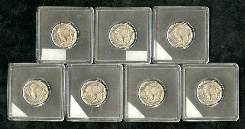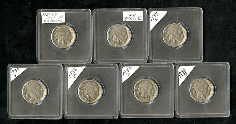 Buffalo Nickels Assortment. 1913 Type I BU; 1936-S EF; 1937-S (2) EF, one with a facial scratch; 1938-D (3) VF or better. [7]