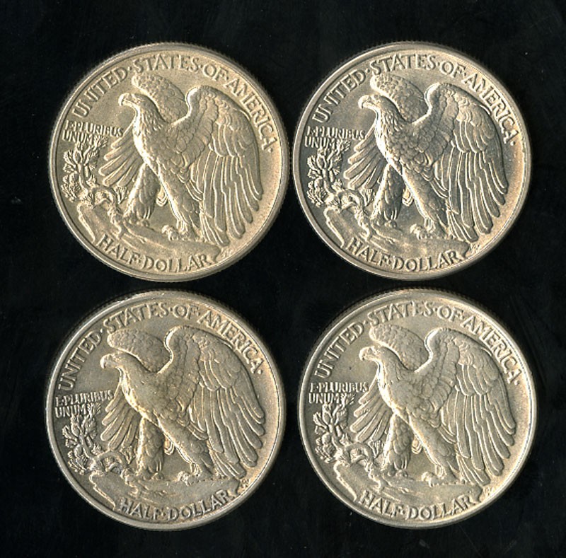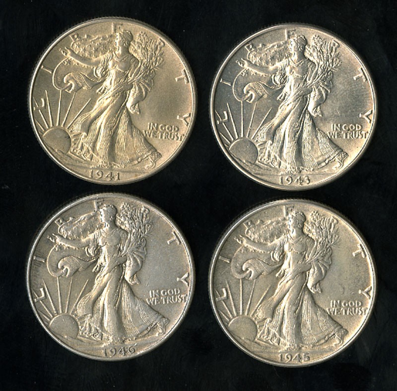 Walking Liberty Half Dollar Quartet. 1941, 1943, 1945, 1946. AU or better.
