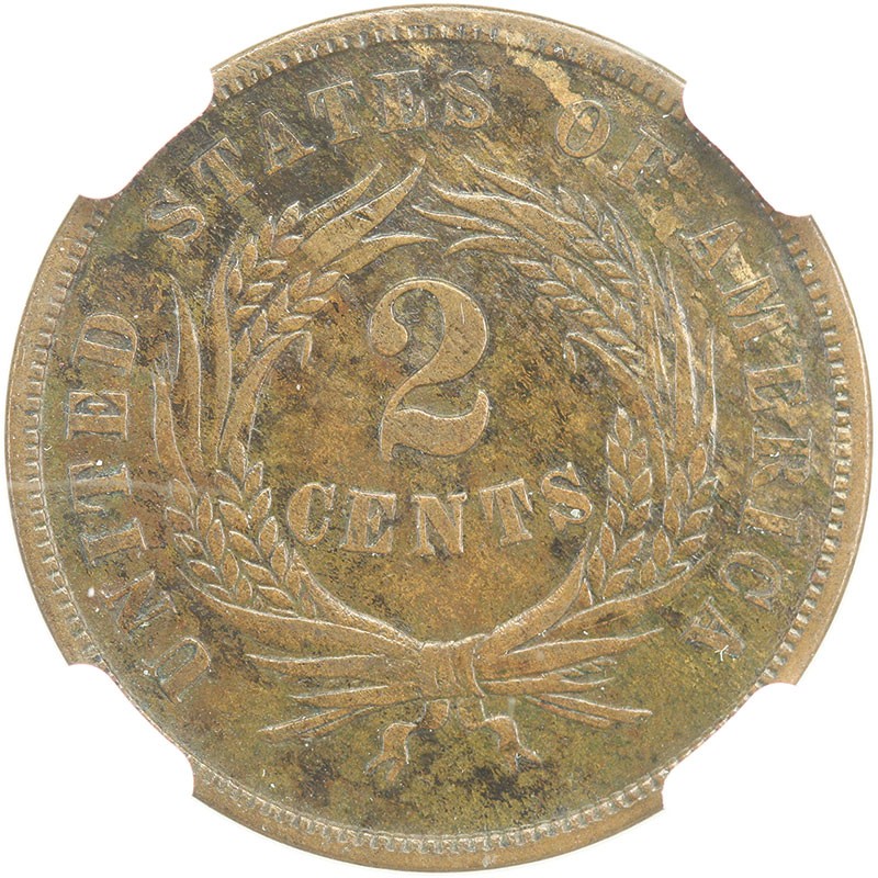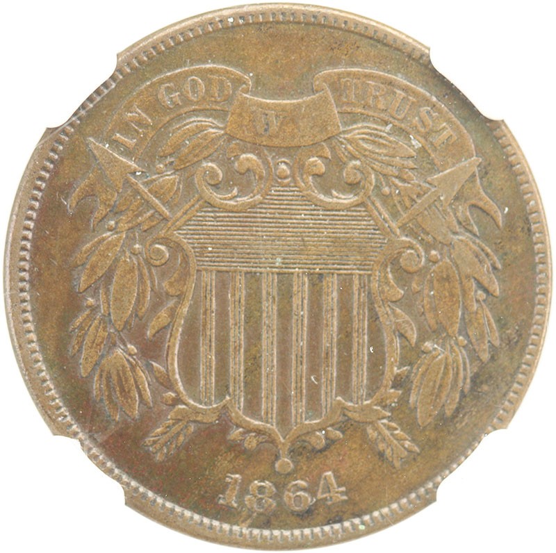 1864/1864 Large Motto Two Cent Piece. VP-004. The 18 of the date dramatically repunched. NGC AU Details, environmental damage. Examination of this olive-brown coin under a glass reveals a degree of surface roughness from poor storage.
