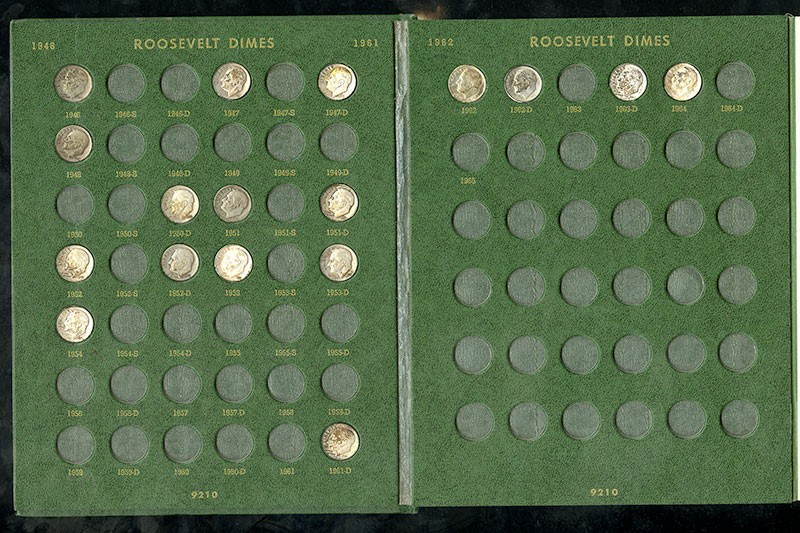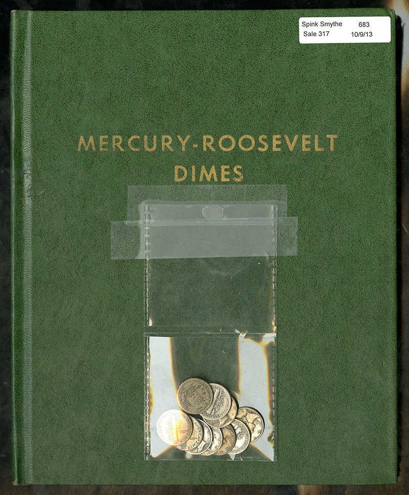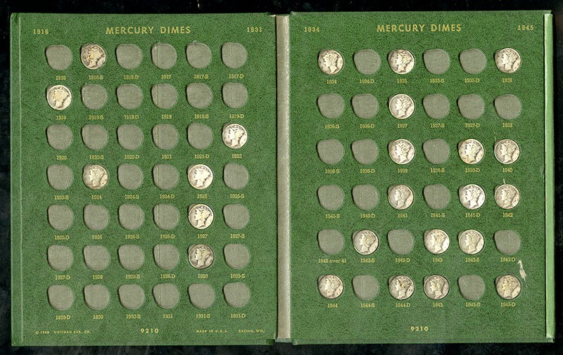 A partial set of Mercury and Roosevelt Dimes. 1916-1964 and some duplicates. The partial set includes 24 different Mercury dimes, mostly in the 1930s and 1940s, and 17 different Roosevelt dates, all silver. Also included are 9 additional Mercury dimes, and a Barber dime. All are average circulated. [51]