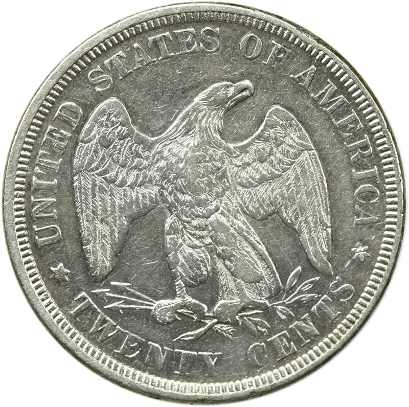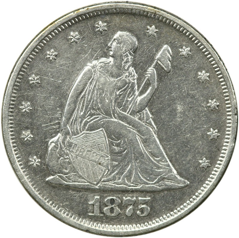 1875 Twenty Cent Piece. AU or nearly so. Pale silvery-white surfaces reveal only a scattering of light marks in the fields on the obverse. A mere 36,910 business strikes were coined of this scarcer twenty cent piece issue.