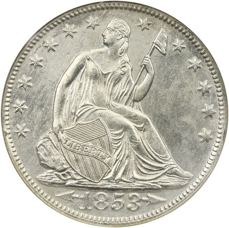 1853-O Arrows and Rays Seated Liberty Half Dollar. NGC SS Republic, Shipwreck Effect. Easily AU or better from the standpoint of wear, this specimen displays a degree of surface porosity that is not as egregious as that of most coins reclaimed from this important treasure trove. Moreover, the scarcity of the New Orleans Mint date (as well as the one year Arrows and Rays type) offered here certainly distinguishes this coin. Here is your chance to own a piece of maritime history at a very affordable price!