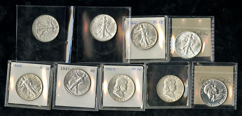 A Group of U.S. Half Dollars. 1943 AU; 1944 AU; 1945 (2) AU; 1946-D BU; 1947-D BU; 1949 AU; 1951-S AU; 1955 Proof. Sold as is. [9]