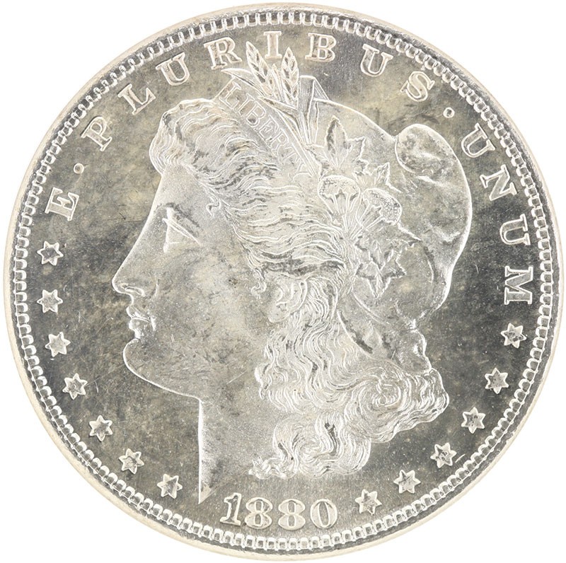1880-S Morgan Dollar. NGC MS66PL. Only a hint of subtle obverse cloudiness is evident over fully struck devices and nicely mirrored fields. In fact, the degree of reflectivity on this example is more akin to a deep prooflike designation.