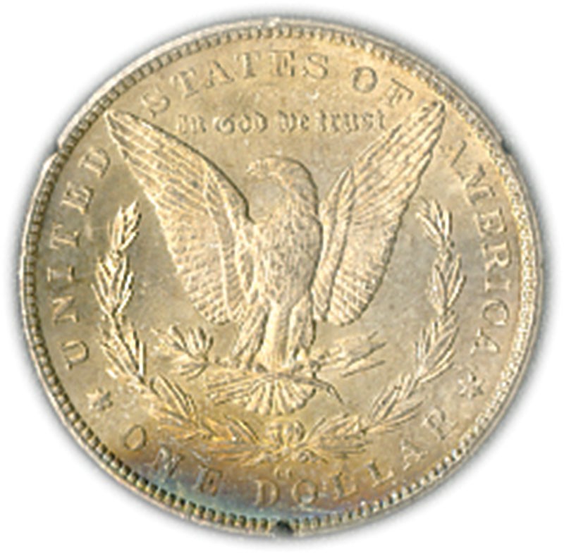 1882-CC $1 Morgan in GSA Holder. Choice Brilliant Uncirculated. Marvelous gold and iridescent toning on the reverse. A pretty coin.