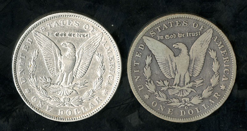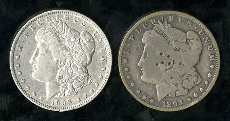 A Pair of Scarce Date Morgan Dollars. 1893 F-VF, but lightly cleaned; 1893-O Good, with some severe obverse damage. Each coin with an original mintage of under 400,000 pieces struck. Sold as is. [2]