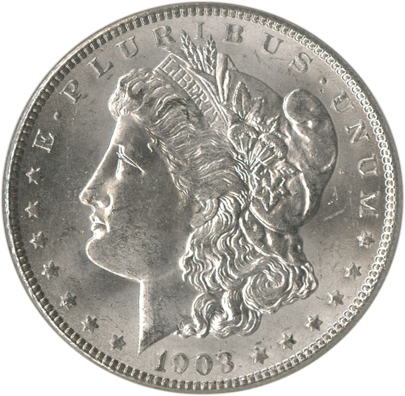 1903-O Morgan Dollar. NGC MS63. A blush of delicate lilac toning embellishes wonderfully rich, satin-silk mint bloom. Scarce and popular in all grades.