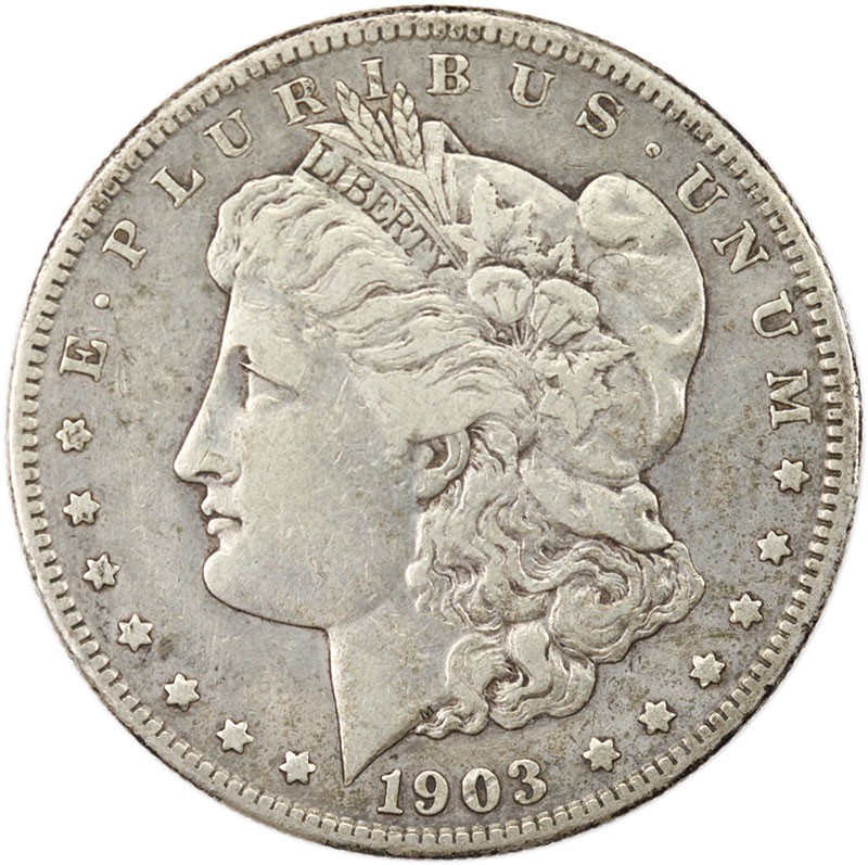 1903-S Morgan Dollar. A strong VF, approaching EF with respect to wear. Closer scrutiny uncovers the presence of some very faint hairlines from a past deceptive cleaning. Scarce.