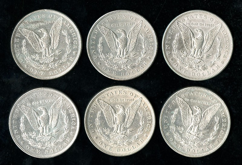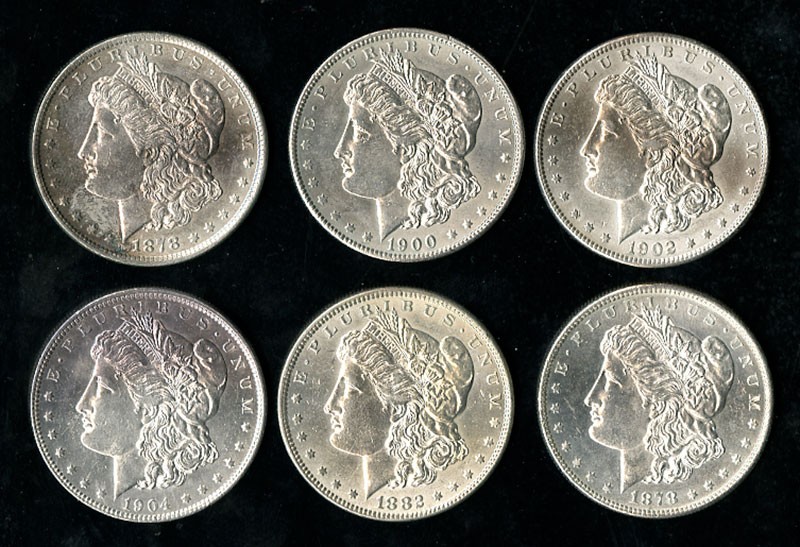 Six High Grade Morgan Dollars. 1878 7 Tail Feathers AU; 1878-S BU; 1882 AU; 1900 AU; 1920-O ABT Unc; 1904-O BU. [6]