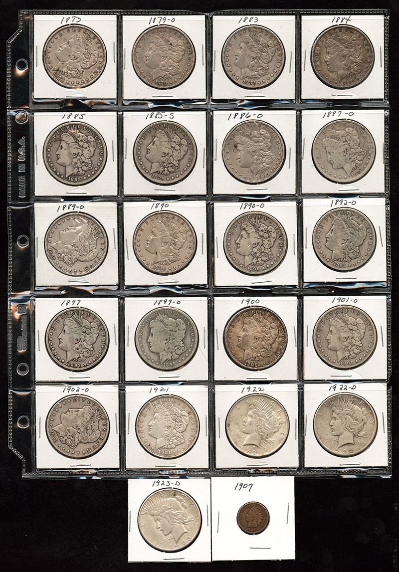 Silver Dollar Assortment. 1878 7F VF; 1879-O VF; 1883 F-VF; 1884 EF; 1885 VG-F; 1885-S VG; 1886-O VF; 1887-O Good, stains; 1889-O VF; 1890 EF-AU; 1890-O Fine; 1892-O Fine; 1897 Fine; 1899-O Good; 1900 Unc. toned; 1901-O Fine; 1902-O Fine; 1921 Morgan EF; 1922 Peace AU; 1922-D VF; 1923-D AU. Also included is a 1907 Indian Cent Good. [22]
