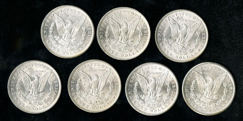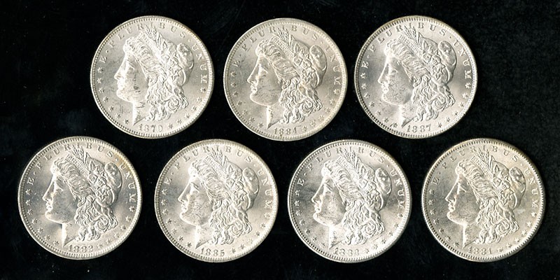 A Lovely Group of Morgan Silver Dollars. 1879-S BU. and Frosty; 1881-S BU. virtually Choice, great luster; 1882-O BU; 1882-S BU. Flashy; 1884-O BU; 1885-O BU; 1887 BU. [7]