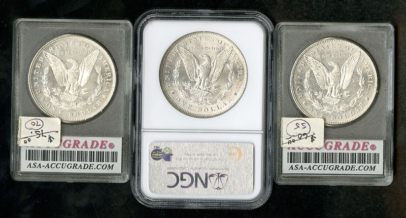 A Trio of Morgan Silver Dollars. 1881 AGC MS63 PL; 1886 NGC 63, "The Fitzgerald Collection."; 1889 ACG MS63 PL. [3]