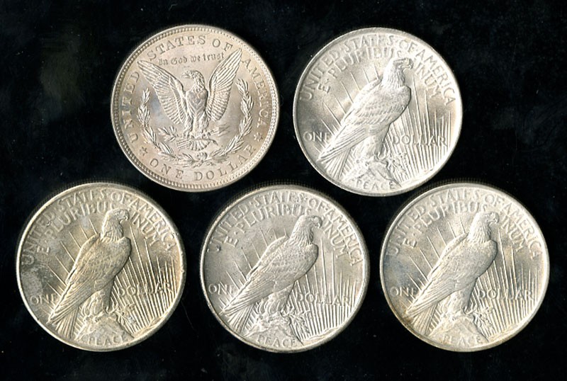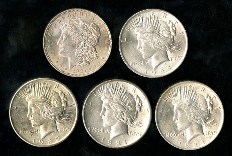 A Quintet of U.S. Silver Dollars. 1921 Morgan. BU; 1921 Peace BU and quite decent for the grade; 1923 BU with good luster; 1924 BU; 1925 BU, with delightful gold toning. Must be seen. [5]