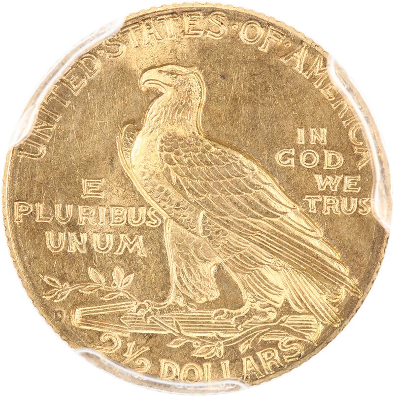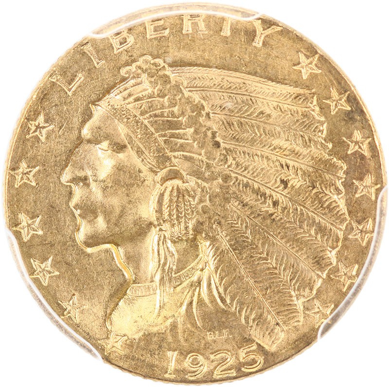 1925-D $2.5 Indian. PCGS MS63. Rich mint frost is complemented by an overlying hint of coppery-golden toning.